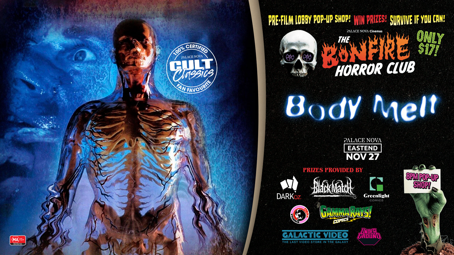 Boasting a cast of Aussie TV favourites, including Ian Smith, William McInnes and Lisa McCune - and graphic gore effects created by make-up master Bob McCarron (The Matrix, Braindead) - Body Melt is a satirical, offbeat splatter film that is proudly "packed with more mucous, phlegm, puke, snot, slime and spit than you'd ever think possible" Starburst.